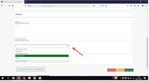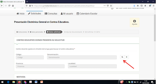 Seguidamente indicamos los motivos de nuestra solicitud y seleccionamos en el desplegable quien presenta la solicitud.