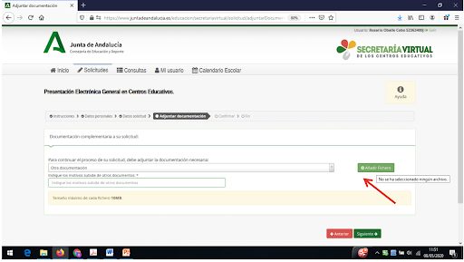 En esta página vamos a incorporar la documentación. Para ello, seleccionamos otra documentación e indicamos los motivos de subida de la documentación (por ejemplo: solicitud de certificado de notas, solicitud de certificado de matrícula, ….).