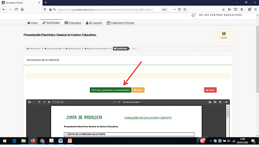 Ahora hay que confirmar la solicitud. Para ello hay que firmar y presentar pinchando en